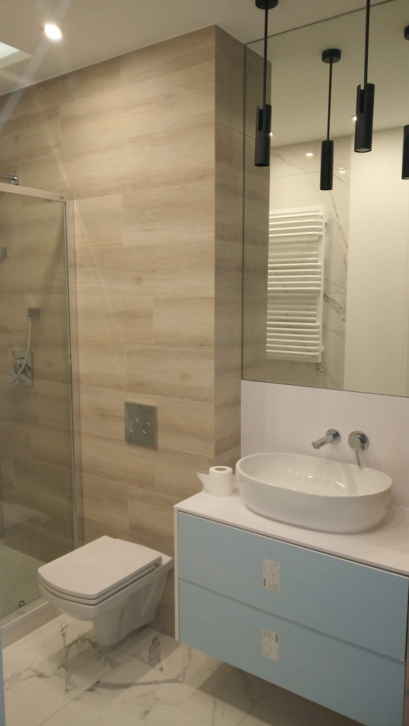 Kompleksowe wykończenie nowego mieszkania wg projektu – wykończenie łazienki, zmiany instalacja elektryczna, zmiany instalacji wod/kan, szpachlowanie, malowanie, położeni kafli na podłodze, montaż drzwi kasetowych.